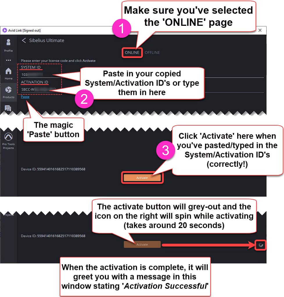 Paste or type your Sibelius Licence System & Activation ID’s into the ‘Online’ activation page of Avid Link & click ‘Activate’: