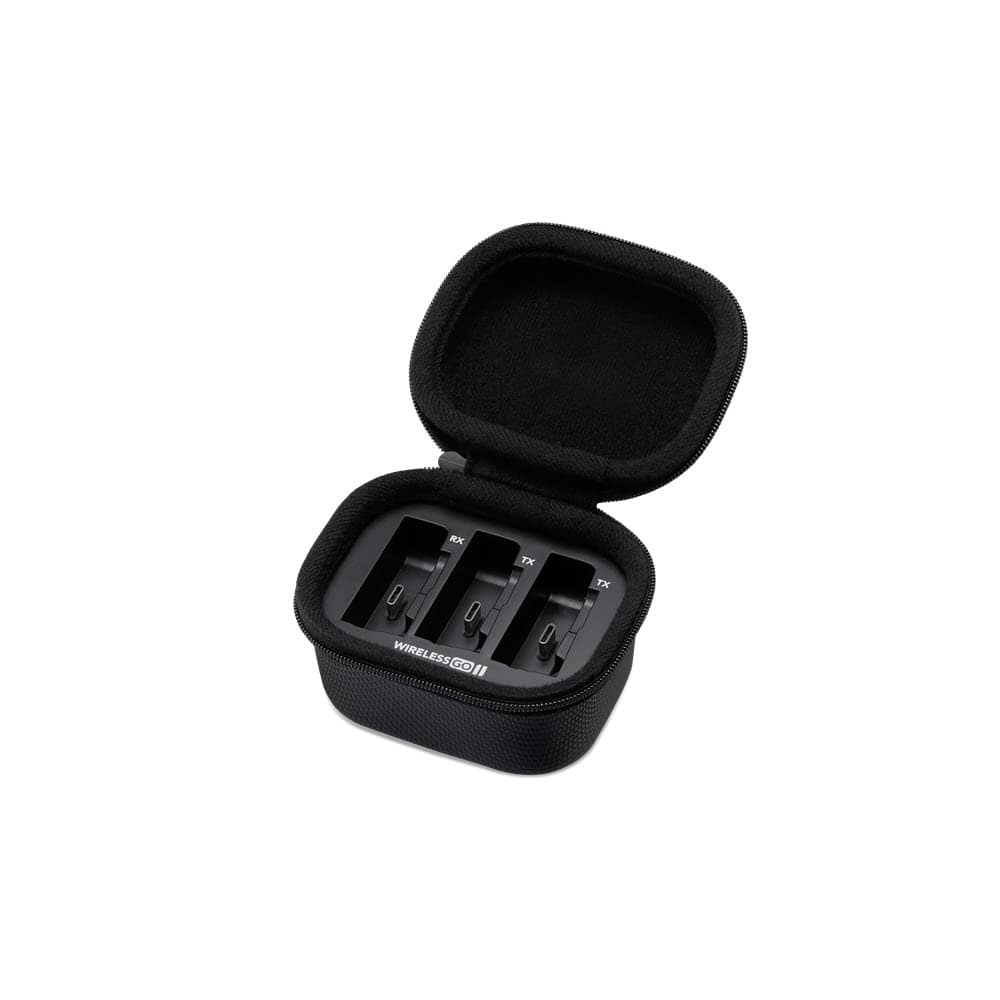 The Rode Charge Case is a handy charging case for the Wireless GO II. It accommodates both transmitters and the receiver and features an integrated battery that facilitates two full recharges of the system for up to 21 hours of continuous use. With a rugged enclosure and zip system, it is also perfect for protecting the Wireless GO II when in transit or storage.